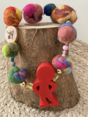 kind maakt op school van viltwol een eigen kraal in zelfgekozen kleuren.