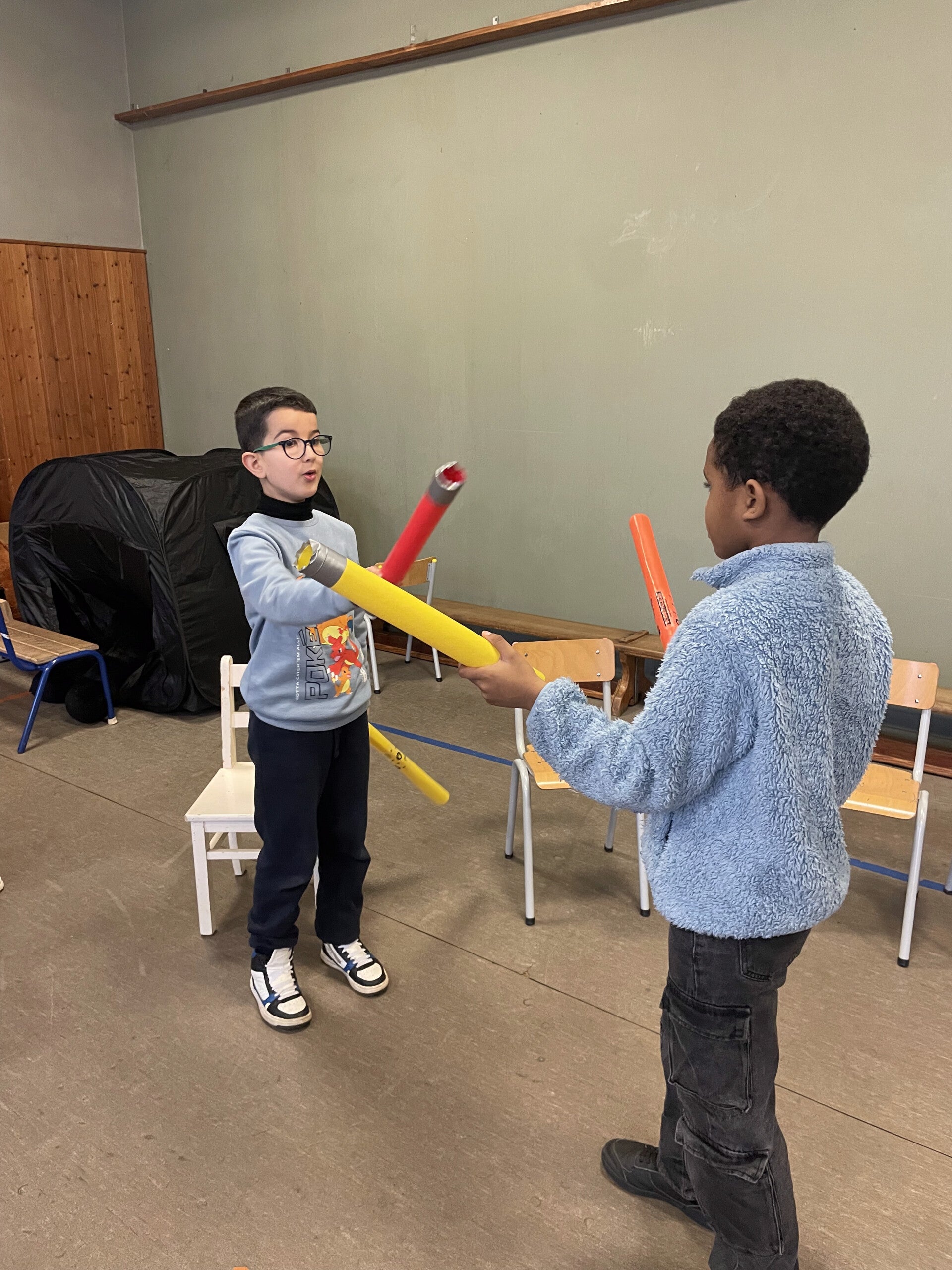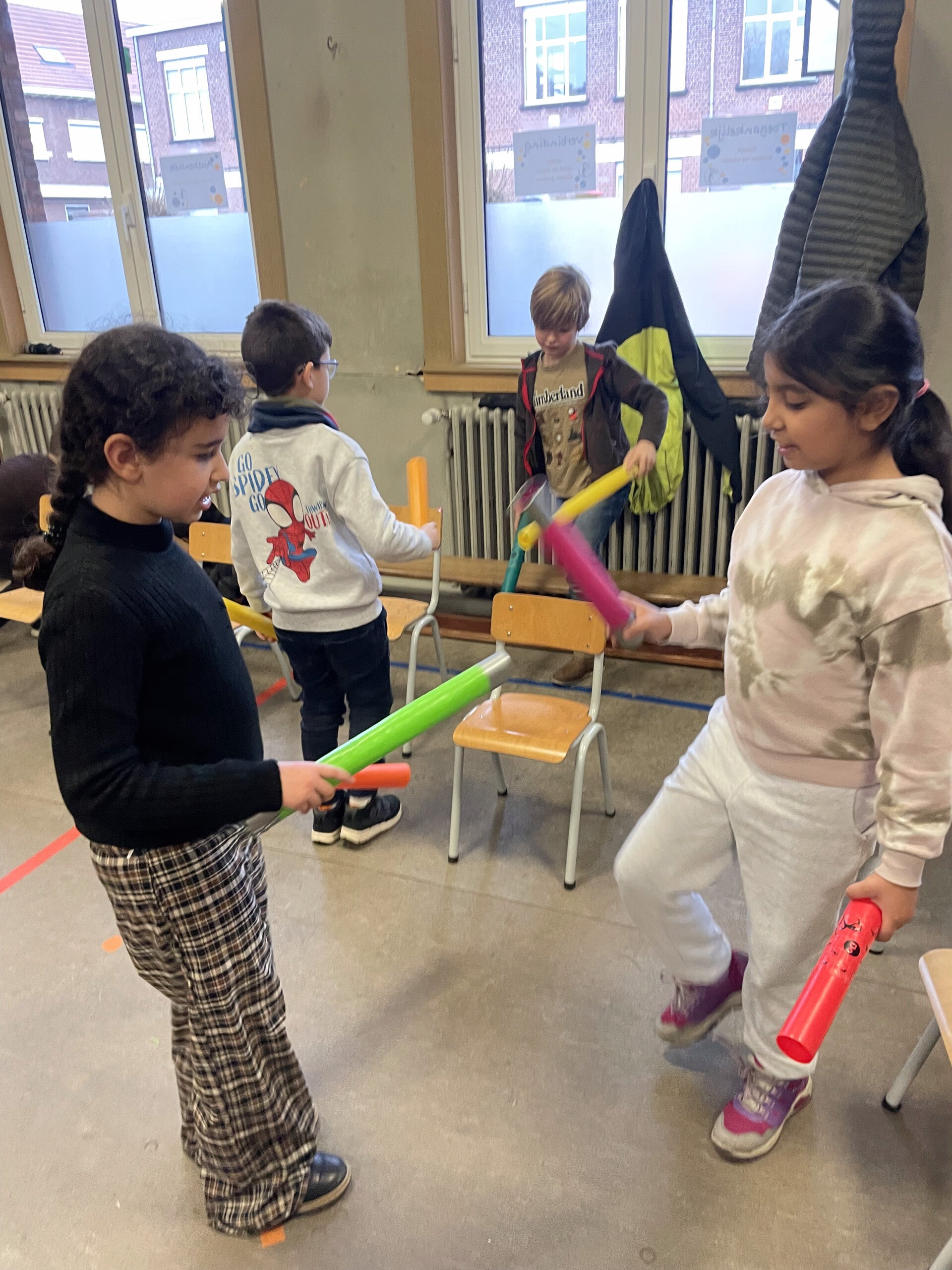 We kregen bezoek van een meester die allerlei gekleurde buizen bij had. Deze buizen waren erg speciaal, want je kon er muziek mee maken! Ze heten BOOMWHACKERS. De verschillende groottes zorgen voor verschillende klanken. We oefenden verschillende ritmes en konden nadien zelfs een liedje spelen!